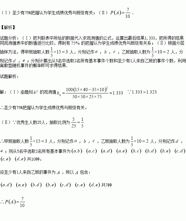 (Ⅱ)用分层抽样方法在成绩优秀的学生中随机抽取5名,并从5名学生中随机选取2名介绍经验,求至少有1人来自乙班的概率。