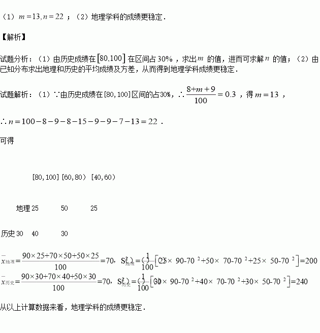 根据频数分布表中的数据估计历史和地理的平均成绩及方差(同一组数据用该组区间的中点值作代表),并估计哪个学科成绩更稳定.