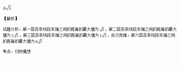 一种平面分形图的形成过程如下图所示,第一层是同一点出发的三条线段,长度均为1,每两条线段夹角为 120°;第二层是在第一层的每一条线段末端,再生成两条与该线段成120°角的线段,长度不变;第三层按第二层的方法再在第二层每一条线段的末端各生成两条线段;重复前面的作法,直至第6层,则分形图第6层各条线段末端之间的距离的最大值