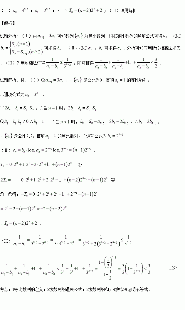 设数列{an}满足:a1=1,an+1=3an,n∈N*.设Sn为数列{bn}的前n项和,已知b1≠0,2bn–b1=S1•Sn,n∈N*.