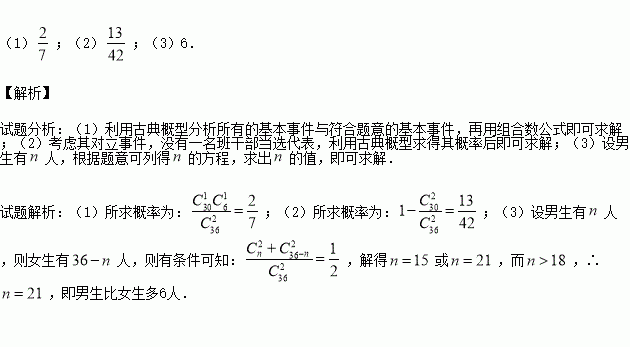 (3)已知36名学生中男生比女生多,若选得同性代表的概率等于