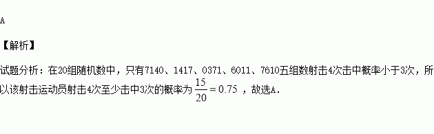 现采用随机模拟的方法估计该运动员射击4次,至少击中3次的概率:先由计算器给出0到9之间取整数值的随机数,指定0,1表示没有击中目标,2,3,4,5,6,7,8,9表示击中目标,以4个随机数为一组,代表射击4次的结果,经随机模拟产生了20组随机数: