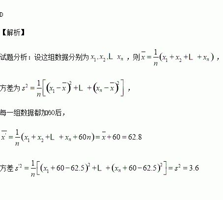 一组数据的平均数是2.8,方差是3.6,若将这组数据中的每一个数据都加上60,得到一组新数据,则所得新数据的平均数和方差分别是( )