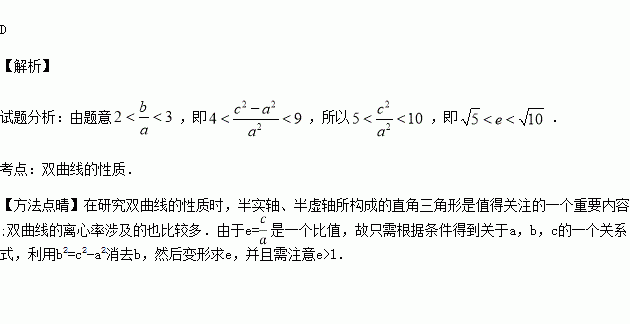 作一条直线,当直线斜率为2时,直线与双曲线左、右两支各有一个交点;当直线斜率为3时,直线与双曲线右支有两个不同的交点,则双曲线离心率的取值范围为( )