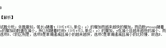 所截上方圆弧长记为x,令y=cosx,则y与时间t(0≤t≤1,单位:s)的函数y=f(t)的图象大致为( )