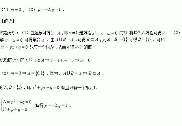 (13分)设集合A={x|x2-x+m=0},B={x|x2+px+q=0},且A∩B={1},A∪B=A.