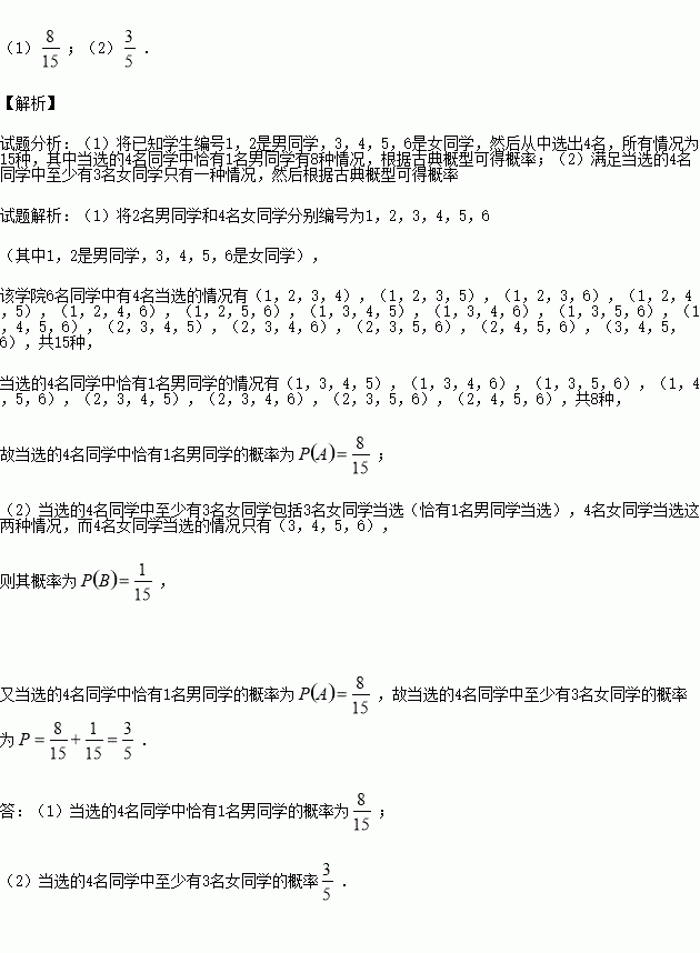 (2)求当选的4名同学中至少有3名女同学的概率.