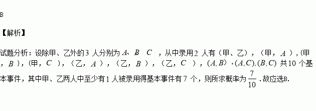 某单位从包括甲、乙在内的5名应聘者中招聘2人,如果这5名应聘者被录用的机会均等,则甲、乙两人中至少有1人被录用的概率是( )