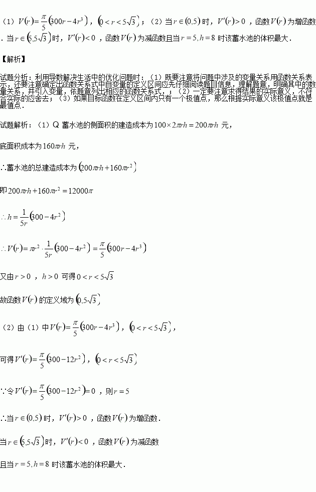 立方米.假设建造成本仅与表面积有关,侧面的建造成本为100元/平方米,底面的建造成本为160元/平方米,该蓄水池的总建造成本为