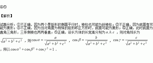 ⑤长方体一条对角线与同一个顶点的三条棱所成的角为