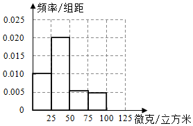 | 组别 | PM2.5浓度(微克/立方米) | 频数(天) | 频率 |
