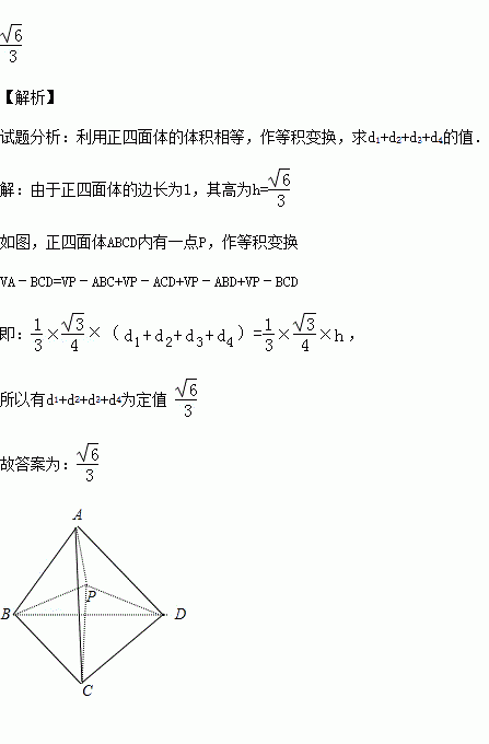 (2014秋•东阳市校级期中)棱长为1的正四面体内有一点P,由点P向各面引垂线,垂线段长度分别为d1,d2,d3,d4,则d1+d2+d3+d4的值为 .
