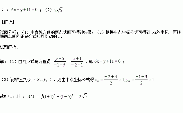 已知三角形ABC的顶点坐标为A(-1,5)、B(-2,-1)、C(4,3),M是BC边上的中点。