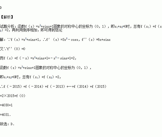 (2015•河南二模)设函数y=f(x)的定义域为D,若对于任意的x1,x2∈D,当x1+x2=2a时,恒有f(x1)+f(x2)=2b,则称点(a,b)为函数y=f(x)图象的对称中心.研究函数f(x)=x3+sinx+1的某一个对称中心,并利用对称中心的上述定义,可得到f(﹣2015)+f(﹣2014)+f(﹣2013)+…+f(2014)+f(2015)=( )