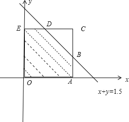 而x+y<1.5表示的区域为直线x+y=1.5下方,且在0≤x≤1,0≤y≤1表示区域内部的部分,