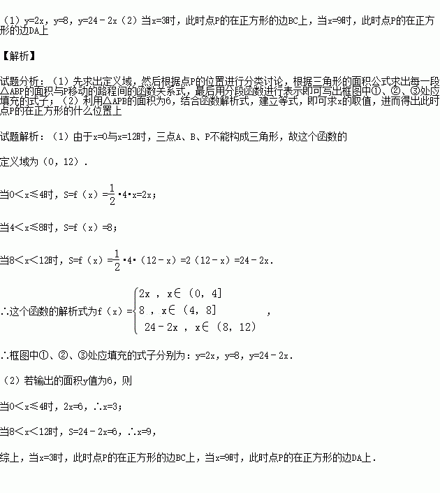 (2)若输出的面积y值为6,则路程x的值为多少?并指出此时点P的在正方形的什么位置上?