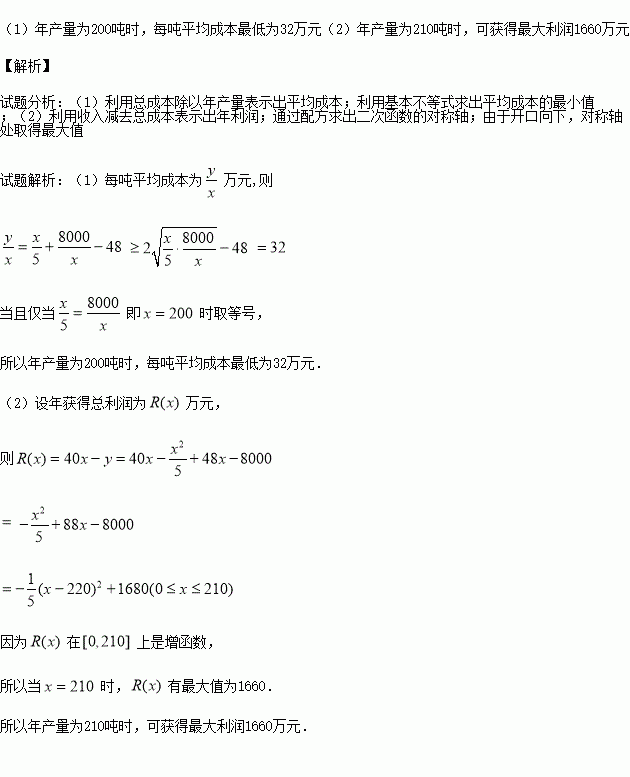 (2)若每吨产品平均出厂价为40万元,那么当年产量为多少吨时,可以获得最大利润?最大利润是多少?