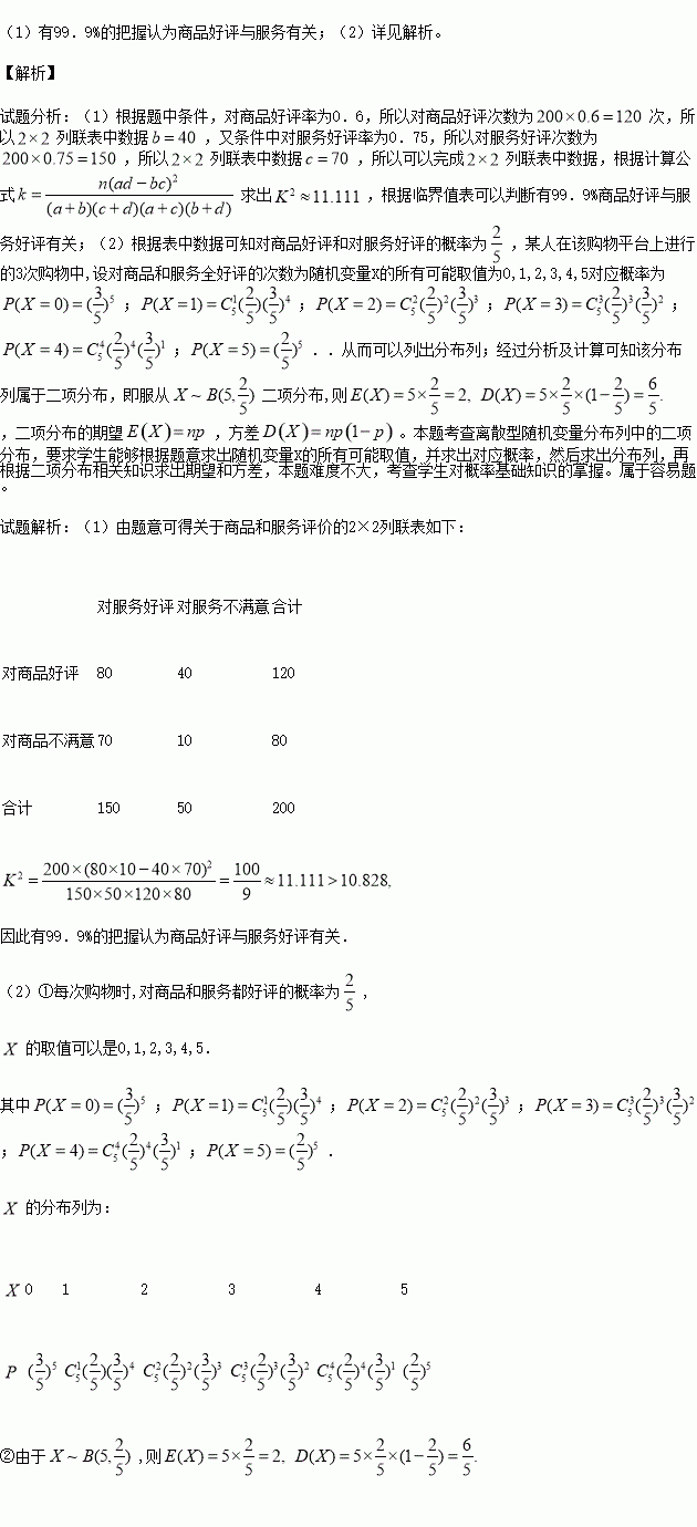 (1)根据题中数据完成下表,并通过计算说明:能否有99.9%的把握认为,商品好评与服务好评有关?