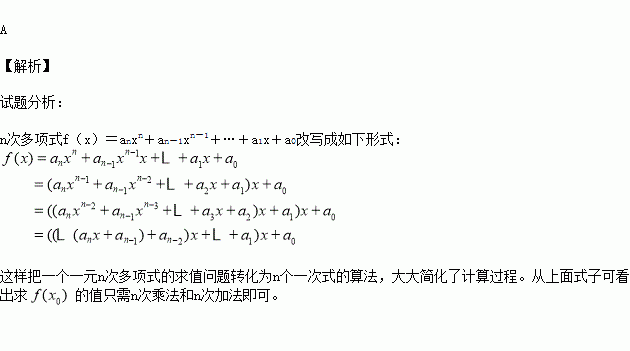 已知n次多项式f(x)=anxn+an-1xn-1+…+a1x+a0,用秦九韶算法求f(x0)的值,需要进行的乘法运算、加法运算的次数依次是( ).