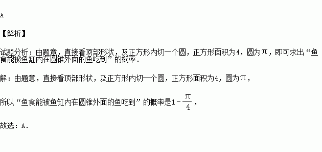 (2015秋•沈阳校级月考)如图,在一个棱长为2的正方体鱼缸内放入一个倒置的无底圆锥形容器,圆锥的上底圆周与鱼缸的底面正方形相切,圆锥的顶点在鱼缸的缸底上,现在向鱼缸内随机地投入一粒鱼食,则“鱼食能被鱼缸内在圆锥外面的鱼吃到”的概率是( )