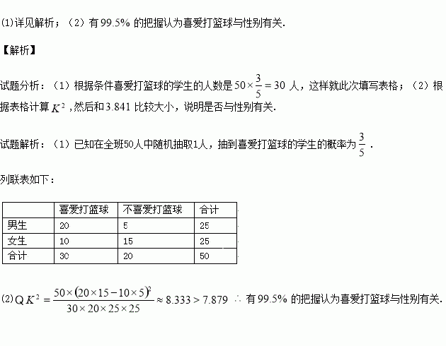 为了解某班学生喜爱打篮球是否与性别有关,对本班50人进行了问卷调查得到了如下列表: