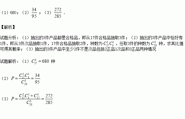 20件产品中有17件合格品,3件次品,从中任意抽取3件进行检查,问