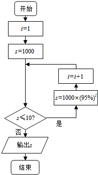分析 本题选择指数函数型的函数模型解决.经过一年,剩留物质约是原来的1000×95%,经过二年,剩留物质约是原来的1000×(95%)2,…十年后,剩留物质的量为1000×(95%)10,由已知中程序的功能为用循环结构计算1000×(95%)10的值,为累乘运算,且要反复累加10次,可令循环变量的初值为1,终值为10,步长为1,由此确定程序框图.