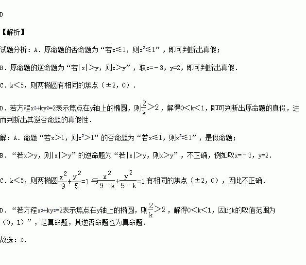 D.命题“若方程x2+ky2=2表示焦点在y轴上的椭圆,则k的取值范围为(0,1)”的逆否命题