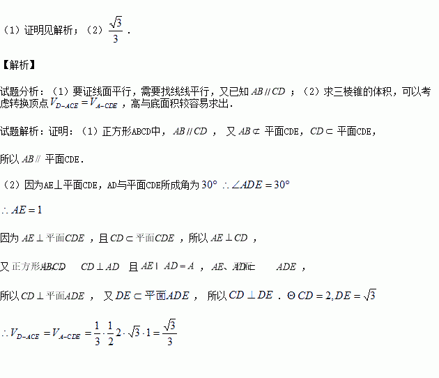 如图:已知正方形ABCD的边长为2,且AE⊥平面CDE,AD与平面CDE所成角为