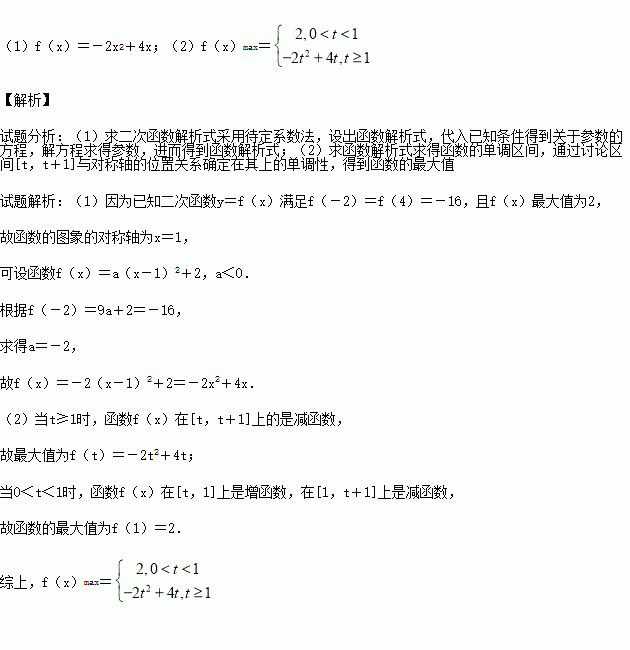 已知二次函数y=f(x)满足f(-2)=f(4)=-16,且f(x)最大值为2.