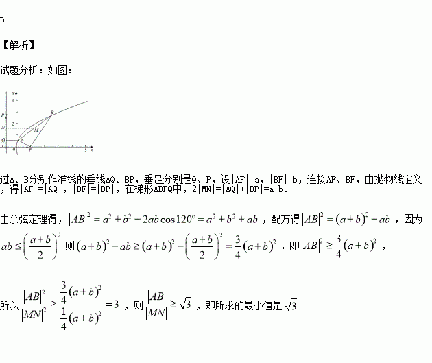 抛物线y2=2px(p>0)的焦点为F,已知点A,B为抛物线上的两个动点,且满足∠AFB=120°.过弦AB的中点M作抛物线准线的垂线MN,垂足为N,则