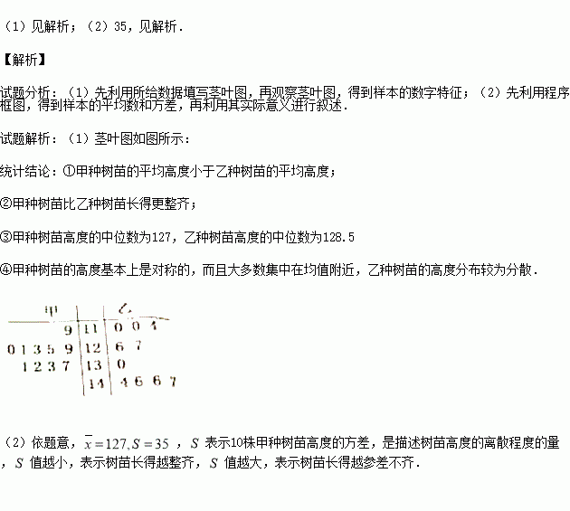 (1)根据抽测结果,画出甲 、乙两种要树苗高度的茎叶图,并根据你填写的茎叶图,对甲、乙两种树苗的高度作比较,写出对两种树苗高度的统计结论:(至少写2条);