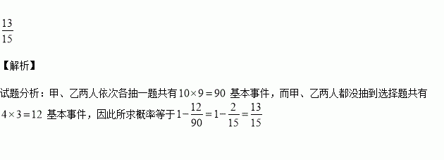 甲、乙两人参加法律知识竞赛,共有10道不同的题目,其中选择题有6道,判断题4道,甲、乙两人依次各抽一题(不能抽同一题).则甲、乙中至少有一人抽到选择题的概率等于 .(用数字作答)
