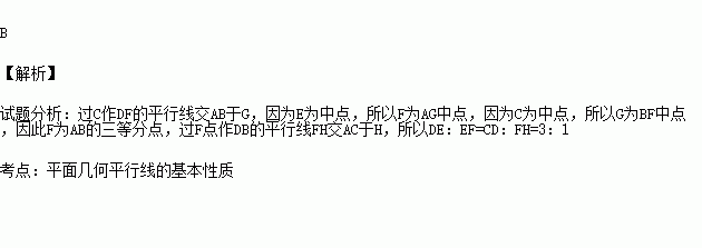 如图,D是△ABC的BC边延长线上一点,且CD=BC,E是AC的中点,DE的延长线交AB于F,则DE:EF等于( )