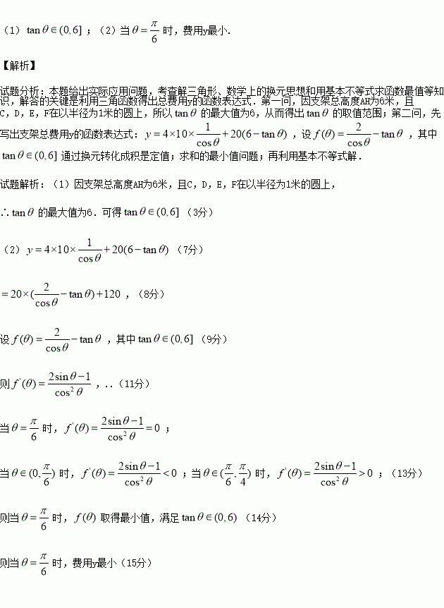 现要设计一个如图所示的金属支架(图中实线所示),设计要求是:支架总高度AH为6米,底座BCDEF是以B为顶点,以CDEF为底面的正四棱锥,C,D,E,F在以半径为1米的圆上,支杆AB⊥底面CDEF.市场上,底座单价为每米10元,支杆AB单价为每米20元.设侧棱BC与底面所成的角为θ.