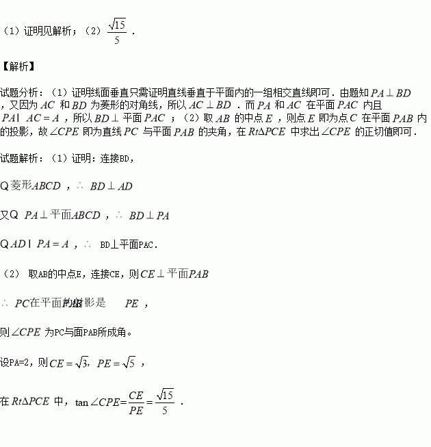 (2)求PC与平面PAB所成角的正切值.