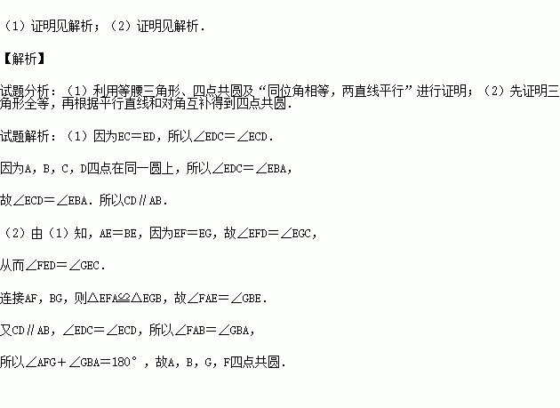 (2)延长CD到F,延长DC到G,使得EF=EG,证明:A,B,G,F四点共圆.