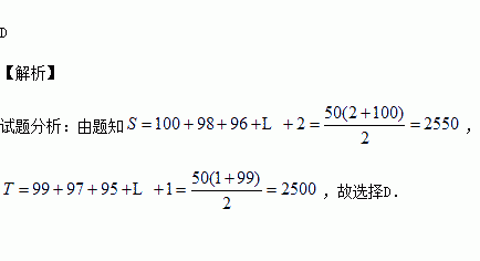 阅读下边的程序框图,若输入的n是100,则输出的变量S和T的值依次是( )