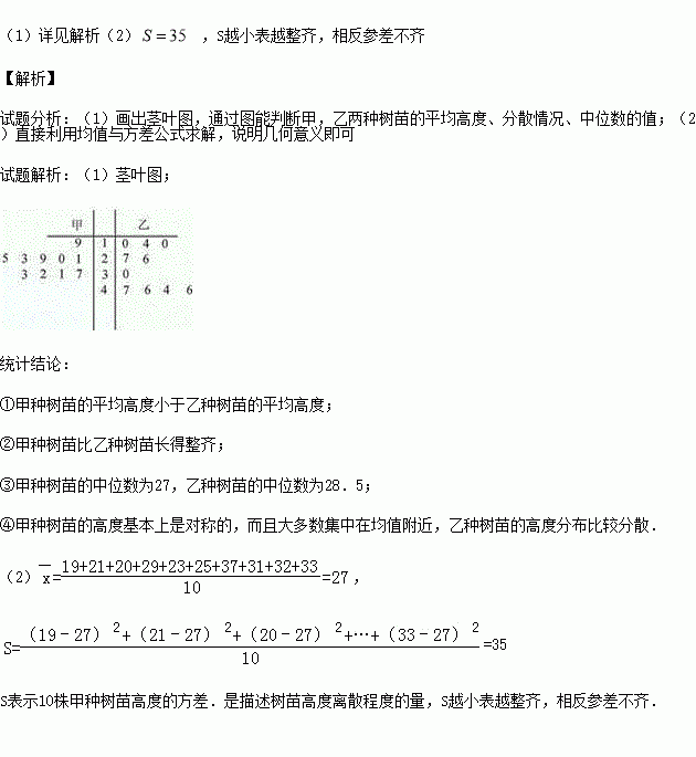 在每年的春节后,某市政府都会发动公务员参与到植树绿化活动中去.林业管理部门在植树前,为了保证树苗的质量,都会在植树前对树苗进行检测.现从甲、乙两种树苗中各抽测了10株树苗,量出它们的高度如下(单位:厘米):