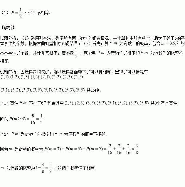 有两枚大小相同、质地均匀的正四面体玩具,每个玩具的各个面上上分别写着数字1,2,3,5,同时投掷这两枚玩具一次,记