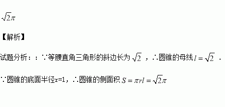 以等腰直角三角形的一条直角边所在直线为旋转轴,将该三角形旋转一周,若等腰直角三角形的直角边长为1,则所得圆锥的侧面积等于__________。