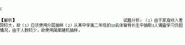 要完成下列两项调查:(1)某社区有100户高收入家庭,210户中等收入家庭,90户低收入家庭,从中抽取100户调查消费购买力的某项指标;(2)从某中学高二年级的10名体育特长生中抽取3人调查学习负担情况,应采取的抽样方法是( )