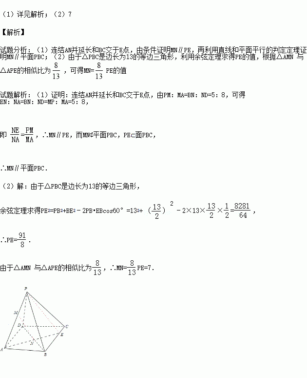 已知正方形ABCD的边长是13,平面ABCD外一点P到正方形各顶点的距离都为13,M、N分别是PA、BD上的点且PM:MA=BN:ND=5:8,如图.