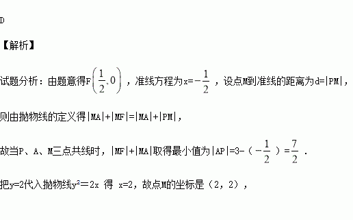 若点A的坐标为(3,2),F是抛物线y2=2x的焦点,点M在抛物线上移动时,使|MF|+|MA|取得最小值的M点的坐标为( )