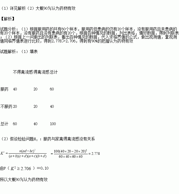 为考察某种药物预防禽流感的效果,进行动物家禽试验,调查了100个样本,统计结果为:服用药的共有60个样本,服用药但患病的仍有20个样本,没有服用药且未患病的有20个样本.