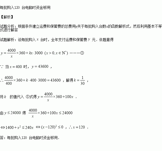 台,且每批均需付运费360元,储存电脑全年所付保管费与每批购入电脑的总价值(不含运费)成正比,若每批购入400台,则全年需用去运费和保管费共43600元,现在全年只有24000元资金可以用于支付这笔费用(运费和保管费),请问能否恰当安排进货数量使资金够用?写出你的结论,并说明理由.