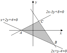 解:由不等式组$\left\{\begin{array}{l}2x-5y+8≥0\\ 2x+y-4≤0\\ x+2y+4≥0\end{array}\right.$作出平面区域如图,