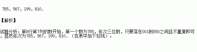 假设要抽查某种品牌的850颗种子的发芽率,抽取60粒进行实验.利用随机数表抽取种子时,先将850颗种子按001,002,…,850进行编号,如果从随机数表第8行第7列的数7开始向右读,请你依次写出最先检测的4颗种子的编号 , , , .