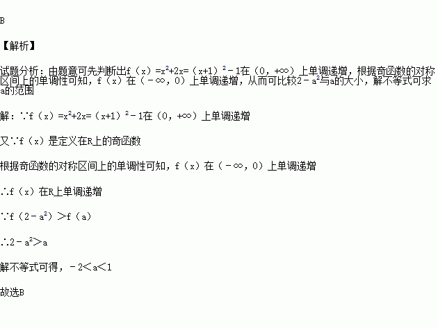 (2013•淄博模拟)已知f(x)是定义在R上的奇函数,当x≥0时,f(x)=x2+2x,若f(2﹣a2)>f(a),则实数a的取值范围是( )