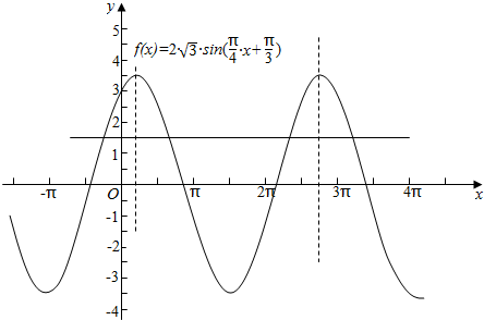 作出f(x)=2$\sqrt{3}$sin($\frac{π}{4}$x+$\frac{π}{3}$),x∈[-2,12]的函数图象如下:![]()